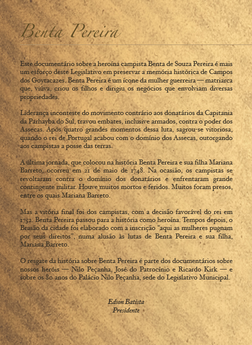 A reverência a Benta Pereira expressa o tributo a uma geração de campistas avessa à obediência cega às ordens da Coroa. Sinal disto é a própria instalação da Câmara em 1652 — desautorizada pelo rei e reafirmada pelos campistas, ilegalmente, em 1656.