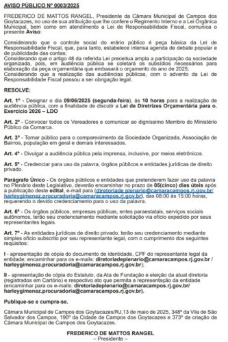 A Câmara Municipal de Campos dos Goytacazes vai realizar audiência pública para discutir a Lei de Diretrizes Orçamentárias para o Exercício 2026 (LDO 2026) no dia 09 de junho, às 10h, no plenário do Legislativo. O Aviso Público nº 0003/2025 foi publicado no Diário Oficial desta quarta-feira (14).