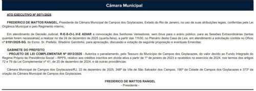 A Câmara Municipal de Campos dos Goytacazes convocou sessão extraordinária para a próxima quarta-feira (24), às 11h30, no plenário. O Ato Executivo nº 0071/2025 com a convocação foi publicado no suplemento do Diário Oficial nesta segunda-feira (22).