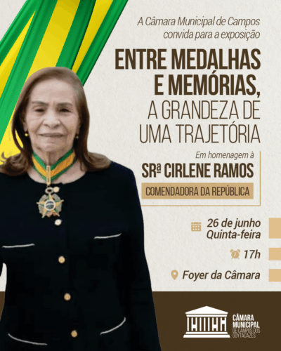 A Câmara Municipal de Campos dos Goytacazes realizará, no próximo dia 26 de junho, às 17h, no Foyer da Casa Legislativa, a abertura oficial da exposição “Entre medalhas e memórias: A grandeza de uma trajetória”, em homenagem à Comendadora da República, Sra. Cirlene Ramos.