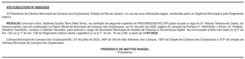 A Câmara Municipal de Campos dos Goytacazes publicou no Diário Oficial desta terça-feira (08), a convocação da Sra. Valdinéa Duarte Terra (Néa Terra), na condição de segunda suplente do PROGRESSISTAS (PP), a partir do dia 11/07/2025.