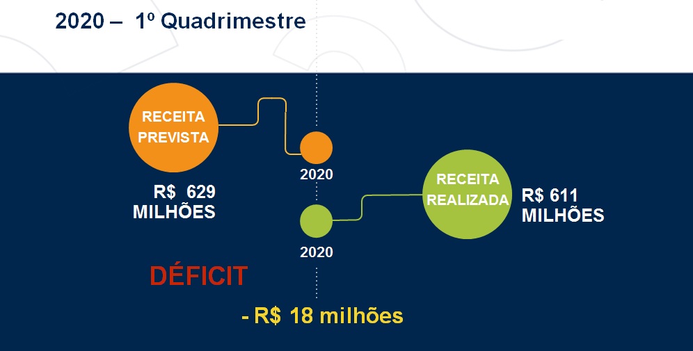 A receita prevista para o 1º Quadrimestre de 2020 era de R$ 629 milhões, sendo realizada R$ 611 milhões. O déficit é de R$ 18 milhões. No período, o total de recursos da Educação foi de R$ 345.001.205,60, representando 25,22% da receita de impostos investidos em ensino. Na Saúde, foram R$ 724.930.289,10, representando 46%.